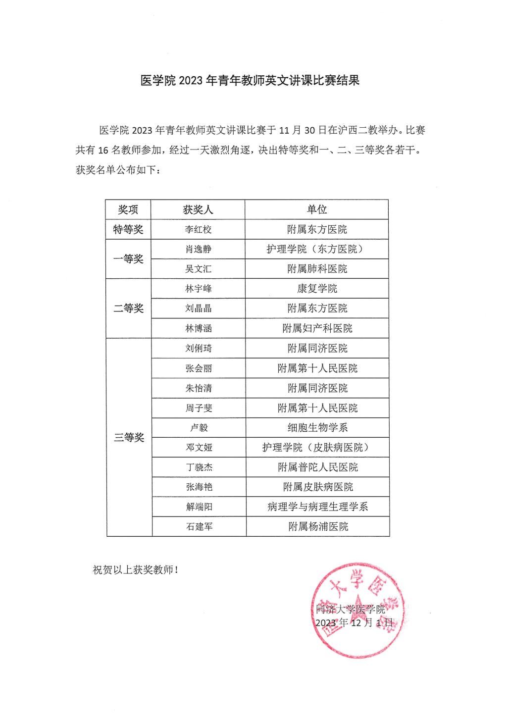 太阳成集团tyc33455cc官网2023年青年教师英文讲课比赛结果