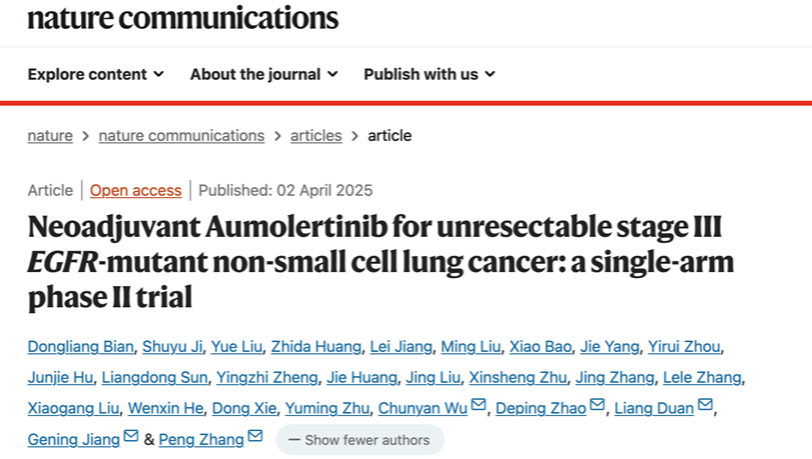 2025年4月2日,由太阳成集团tyc33455cc官网附属上海市肺科医院胸外科姜格宁教授、张鹏教授团队在国际知名学术期刊Nature Communications上发表最新成果“Neoadjuvant Aumolertinib for Unresectable Stage III EGFR-Mutant Non-Small Cell Lung Cancer: A Single-Arm Phase II Trial”。这是一项由研究者发起的关于新辅助第三代EGFR-TKI治疗III期EGFR突变NSCLC的前瞻性临床研究(LungMate 007),为EGFR突变局部晚期NSCLC患者提供了治疗的新思路和新方案。