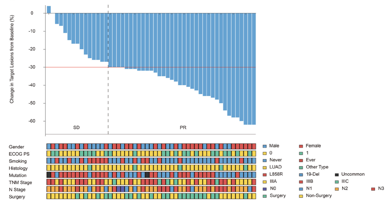 LungMate007是一项单臂II期临床试验,旨在探索新辅助靶向治疗III期EGFR突变NSCLC的可行性。受试者计划接受为期16周的新辅助EGFR-TKI靶向单药治疗,经评估为可切除受试者予以手术治疗,术后强烈建议受试者接受不少于三年的EGFR-TKI靶向辅助治疗;反之,诱导治疗后仍不可切除患者经多学科讨论后确定最佳治疗方案。该研究的主要研究终点为客观缓解率(ORR)。