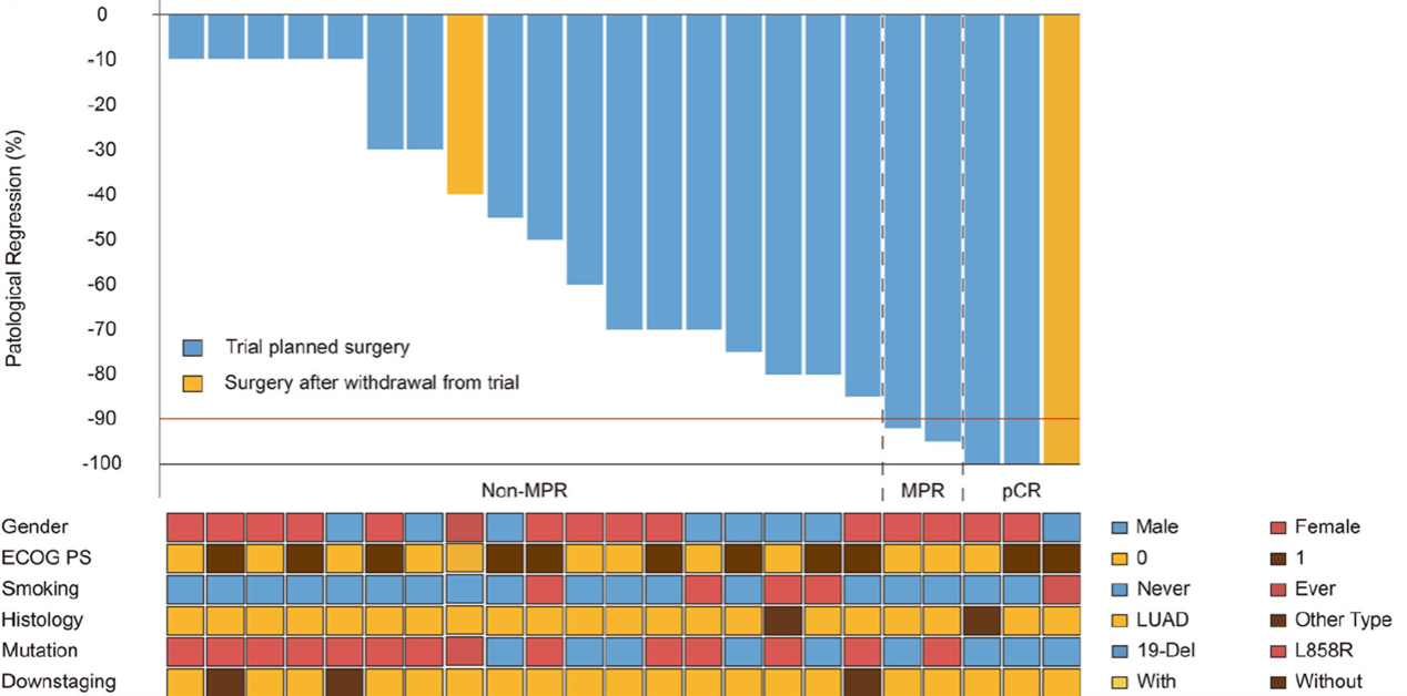 23例受试者成功转化为可手术状态并接受手术治疗(手术转化率45.1%)。其中主要病理缓解率(MPR)21.7%,完全病理缓解率(pCR)13%(图2)。值得一提的是,经甲磺酸阿美替尼新辅助治疗的Exon19-Del突变亚型受试者,其MPR和pCR率分别高达44.4%和33.3%,展现出极佳疗效。治疗相关不良事件(TRAEs)以疲劳(49%)、肝功能异常(39%)、以及皮疹(35%)为主,≥3级TRAEs发生率为9.8%,且无新增不可控毒性,治疗方案安全、可控。