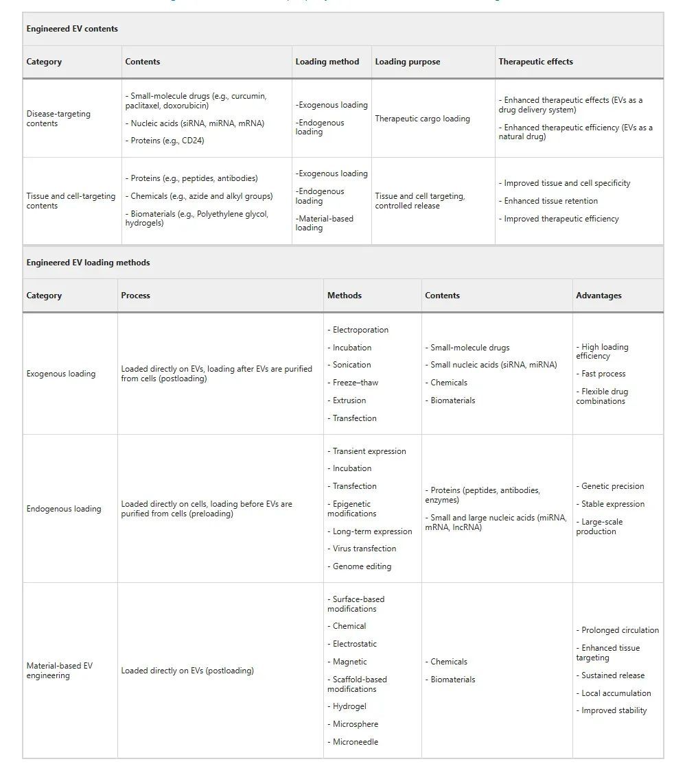 文中总结了自然EVs和工程化EVs在治疗应用中的分类和特点。自然EVs主要来源于哺乳动物细胞、牛奶和植物组织,具有多种生物学功能,如抗炎、免疫调节、组织修复等,并在治疗呼吸系统疾病、神经系统疾病、严重急性炎症和肿瘤等方面展现出潜力。工程化EVs则通过遗传、物理或化学手段对EVs进行改造,以提高其药物负载能力和靶向性,从而增强治疗效果。