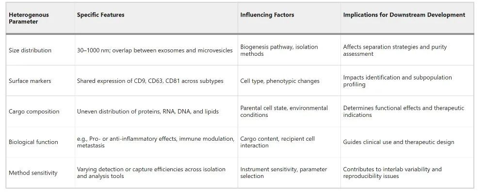 文中详细列出了EVs(微囊泡和外泌体)的异质性参数,包括尺寸分布、表面标记、货物组成、生物学功能以及方法灵敏度。这些参数不仅影响EVs的分离策略和纯度评估,还决定了其在治疗中的功能效果和临床应用前景。例如,EVs的尺寸范围为30-1000 nm,微囊泡和外泌体在尺寸上存在重叠,这增加了分类的难度。EVs表面标记如CD9、CD63、CD81等在不同亚型中均有表达,但具体表达水平可能因细胞类型和环境条件而异。