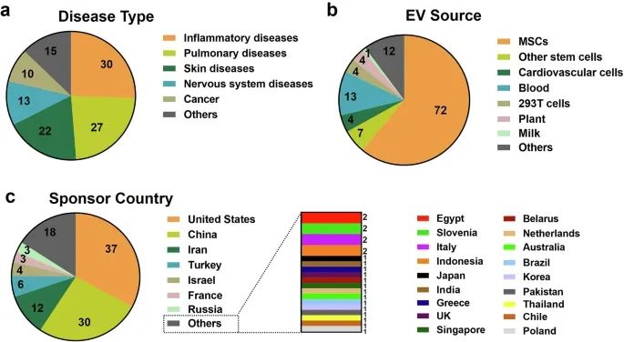 截至2025年1月,全球已有292项与EVs相关的临床试验注册,其中117项为干预性研究,主要集中在炎症、肺部、皮肤和神经系统疾病以及癌症等领域。文中对这些临床试验的疾病类型、EV来源和赞助国家进行了统计分析,显示间充质干细胞(MSCs)是最常用的EV来源,且研究主要集中在中美两国,但全球参与度逐渐增加。