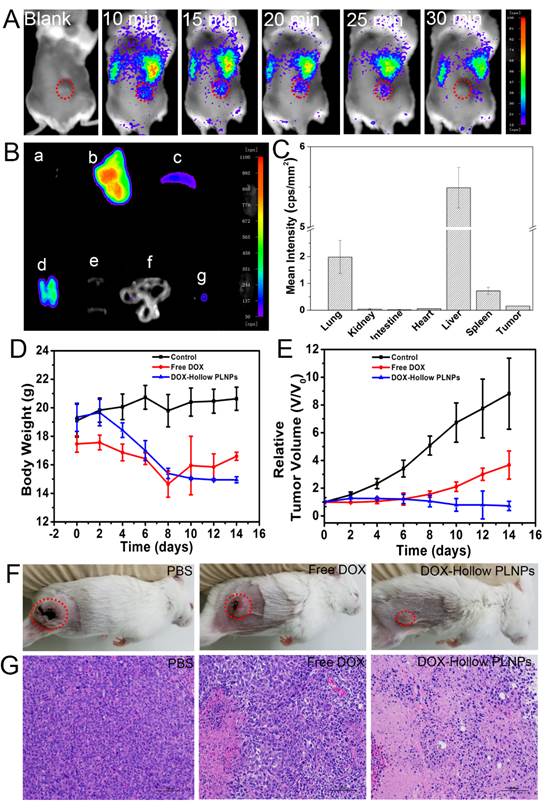 图3. 中空长余辉纳米探针的肿瘤余辉显像及抗肿瘤研究