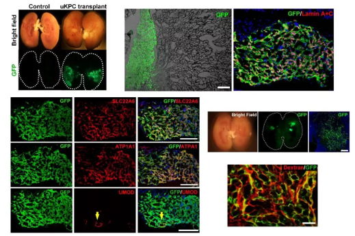值得一提的是,研究团队把从健康人或慢性肾病患者尿液中分离的细胞进行GFP绿色荧光蛋白标记后,移植到损伤小鼠的单侧肾脏中。14天后,在小鼠肾内观察到大面积外源性人源细胞整合,成功构建出了“人-鼠嵌合肾”。这些GFP+细胞在损伤的区域形成了类肾小管的管状腔体结构,且表达不同分段的肾小管特征基因,如PAX8、ATP1A1、SLC22A6和UMOD等。对于接受了细胞移植的肾损伤小鼠,研究人员把带有红色荧光标记的小分子葡聚糖经静脉注射到其血液循环中,发现这种葡聚糖在GFP+人源肾小管结构中聚集,说明由移植的人源肾前体细胞分化形成的近端小管有功能性地与小鼠自身的肾小球过滤系统相连。
