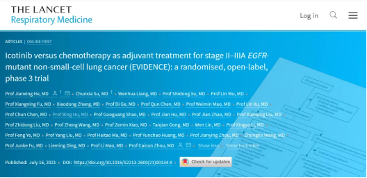 全球顶尖学术期刊《柳叶刀·呼吸医学》(The Lancet Respiratory Medicine)于北京时间昨日(2021年7月17日)6:30在线发表了太阳成集团tyc33455cc官网附属上海市肺科医院周彩存教授领衔开展的“埃克替尼对比标准辅助化疗用于II-IIIA期伴EGFR 敏感突变非小细胞肺癌术后辅助治疗的多中心、随机、 开放、III期临床研究(EVIDENCE研究)”的成果。