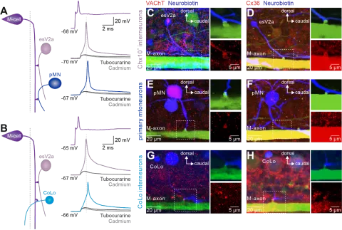为了解答上述问题,研究团队以成年斑马鱼作为模型动物进行了以下的研究。首先,研究者在转基因鱼系Tol-056上,通过基于全细胞膜片钳为基础的单细胞测序,电生理和形态学发现了一组表达Chx10的乙酰胆碱能V2a神经元(英文简称为esV2a,中文翻译为逃逸V2a神经元),进一步研究发现其在躲避行为中被激活,并且接收到Mauthner细胞的单突触信号传入。这一结果与传统上认定的V2a神经元仅仅是谷氨酸能的不同,不但证实了乙酰胆碱能V2a神经元的存在,并且发现其参与了躲避行为。为了验证这组神经元在escape行为产生神经环路中的作用,研究者运用了三通道全细胞膜片钳记录,同时记录了Mauthner细胞、逃逸V2a神经元和局部甘氨酸能神经元/初级运动神经元。当刺激Mauthner细胞产生动作电位后,逃逸V2a神经元,随后激活局部甘氨酸能神经元/初级运动神经元。用双光子激光消除实验杀掉逃逸V2a神经元后,Mauthner细胞无法再激活局部甘氨酸能神经元/初级运动神经元。双通道全细胞膜片钳记录研究进一步证明逃逸V2a神经元可通过单突触兴奋局部甘氨酸能神经元/初级运动神经元,并且脊髓内的逃逸V2a神经元之间存在强的单突触联接。