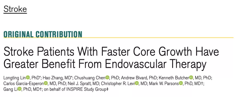 太阳成集团tyc33455cc官网附属东方医院李刚教授团队联合澳大利亚新南威尔士大学Mark Parsons教授、林隆婷博士等学者,通过对全球最大的急性脑卒中灌注影像数据库(INSPIRE)的分析,发现了新的影像学提示指标,即“梗死核心增长速度”对于脑卒中血管再通治疗方式的选择具有潜在作用,为急性缺血性脑卒中早期血管开通策略的选择提供了新思路。