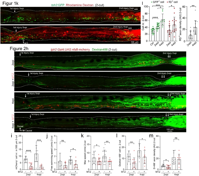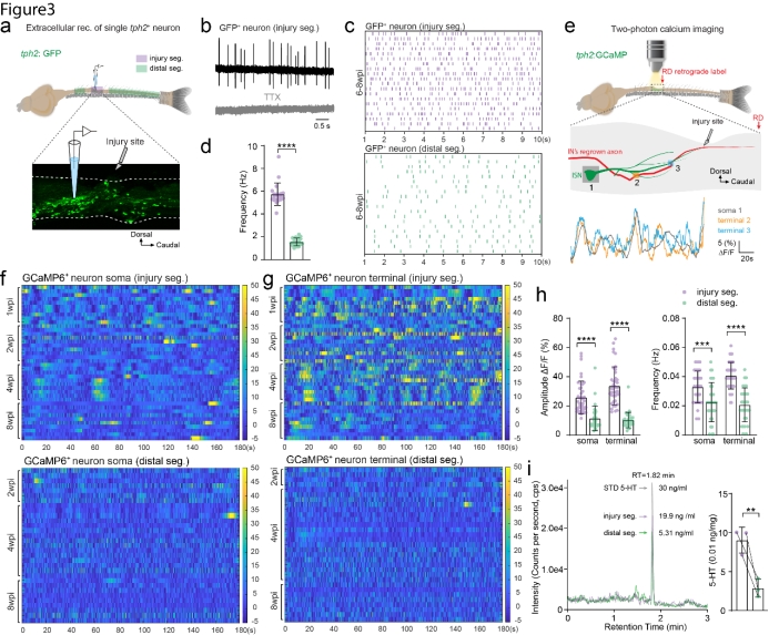 研究者进一步对该群损伤诱导产生的五羟色胺能神经元的特性进行研究,通过电生理,双光子成像,基因表达分析,化学定量的方法发现:在同一损伤的动物脊髓内,与非损伤处的五羟色胺能神经元相比,损伤处五羟色胺能神经元自主发放高频率的动作电位(Figure 3b, c, d),表现出更强的钙信号波动(Figure 3f, j, h),释放更多量的五羟色胺(Figure 3i),以及展现转录组学上的特异性。暗示该群损伤诱导产生的特异性的五羟色胺能神经元通过其高强度度且持续活跃的电活动,为损伤处脊髓节段提供高浓度的五羟色胺微环境,促进受损的脊髓神经环路修复和运动功能的恢复。