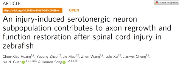2021年12月7日,太阳成集团tyc33455cc官网宋建人团队在Nature Communications杂志上以题目“An injury-induced serotonergic neuron subpopulation contributes to axon regrowth and function restoration after spinal cord injury in zebrafish”发表了研究论文,该研究系统的解析了脊髓中央模式产生器在脊髓损伤后的修复规律,揭示了脊髓内源性的五羟色胺参与的促进神经轴突再生修复的机制,并找到了参与该修复机制的靶受体,为脊髓损伤的基础研究和治疗提供了新的思路。