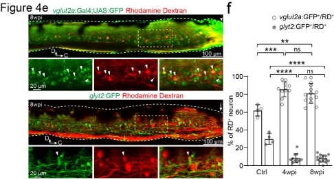 研究者发现,斑马鱼脊髓全切损伤后,其运动能力可修复,但是脊髓中央模式产生器中的兴奋性谷氨酸能与抑制性的甘氨酸中间神经元的比例却发生极大的变化,由未损伤时1:1变为损伤后的8:1(Figure 4e, f),重建的运动神经环路与正常情况下相比发生了变化,尤其是兴奋性与抑制性神经元的构成。那么锚定再生能力更强的兴奋性神经元的修复机制便成为一个突破口。