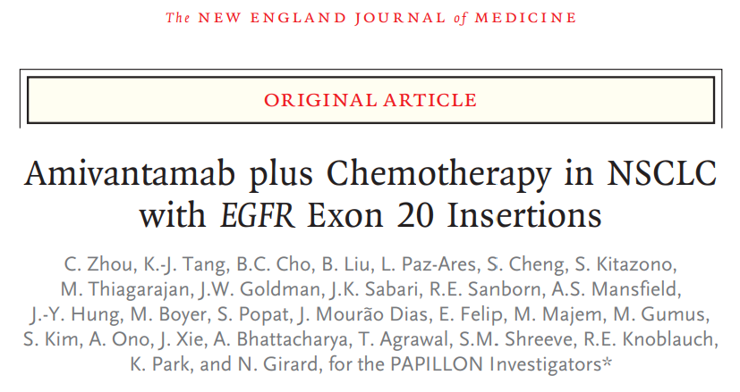 北京时间10月21日晚,《新英格兰医学杂志》(NEJM)与正在西班牙马德里举行的欧洲肿瘤内科学会(ESMO)2023年会同步发表由太阳成集团tyc33455cc官网肿瘤研究所、太阳成集团tyc33455cc官网附属上海市肺科医院周彩存教授领衔的两项国际多中心III期试验结果:PAPILLON研究证明,amivantamab(埃万妥单抗)+化疗可显著延长携带EGFR(表皮生长因子受体)外显子20插入突变的晚期非小细胞肺癌的中位无进展生存期(11.4个月 vs. 6.7个月;HR,0.40;95% CI,0.30~0.53;P<0.001);在另一项纳入RET(转染重排)融合阳性非小细胞肺癌的III期LIBRETTO-431试验中,与含铂方案化疗±帕博利珠单抗相比,selpercatinib(塞普替尼)可将中位无进展生存期延长1倍以上(24.8个月 vs. 11.2个月;HR,0.46;95% CI,0.31~0.70;P<0.001)。