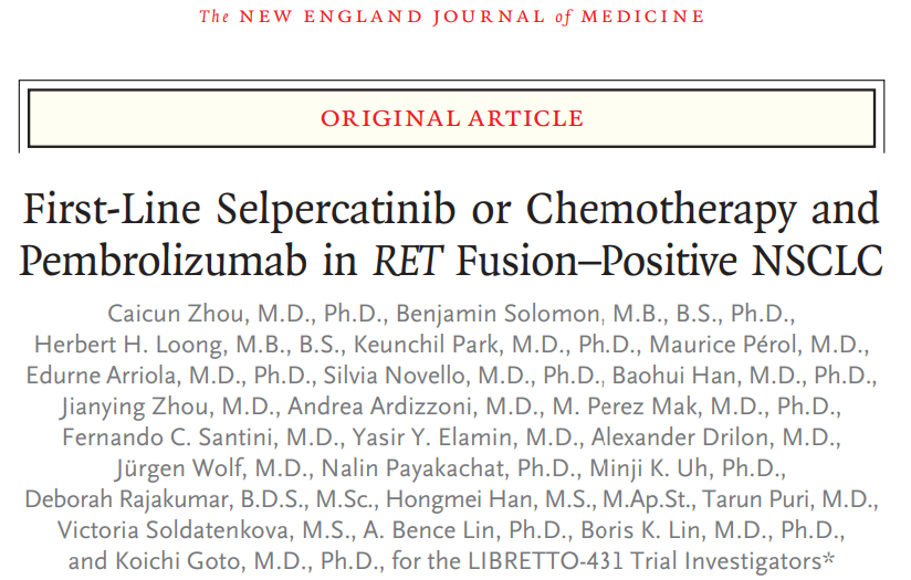 LIBRETTO-431是一项开放标签、随机对照的III期研究,旨在评估selpercatinib对晚期或转移性、未经治疗的 RET 融合阳性非小细胞肺癌患者的疗效。在该试验中,研究比较了一线selpercatinib与对照组铂类化疗(研究者自行决定是否联用帕博利珠单抗)的疗效和安全性。