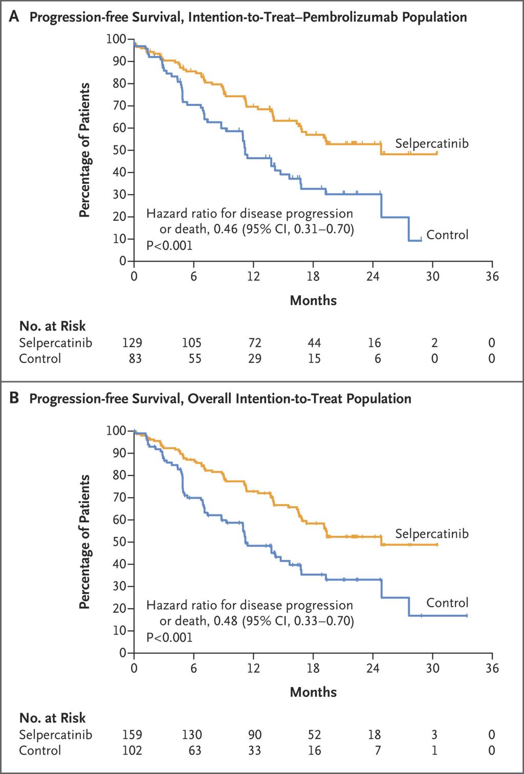 在意向性治疗-帕博利珠单抗人群中,共计212例患者接受了随机分组。依照预先计划进行期中疗效分析时,selpercatinib组的中位无进展生存期为24.8个月(95%置信区间[CI],16.9至无法估计),对照组为11.2个月(95% CI,8.8~16.8)(进展或死亡的风险比,0.46;95% CI,0.31~0.70;P<0.001)。selpercatinib组的客观缓解率为84%(95% CI,76%~90%),对照组为65%(95% CI,54%~75%)。中枢神经系统疾病进展时间的原因特异性风险比为0.28(95% CI,0.12~0.68)。
