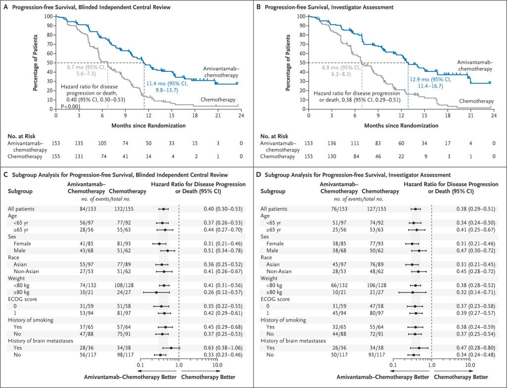 PAPILLON是一项全球III期随机试验,该试验将未接受过治疗的晚期EGFR外显子20插入突变肺癌患者以1:1比例分组,分别接受amivantamab联合化疗(amivantamab+化疗)或单纯化疗。共计308例患者接受随机化分组。试验主要终点是独立审核委员会判定的无进展生存期(PFS)。研究发现,amivantamab+化疗组的中位无进展生存期为11.4个月,显著超过化疗组的6.7个月(HR,0.40;95% CI,0.30~0.53;P<0.001)。amivantamab+化疗组的缓解率为73%,也高于化疗组的47%(P<0.001)。