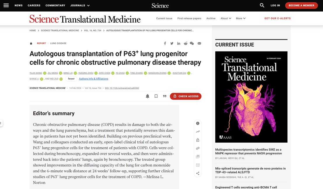 慢性阻塞性肺疾病(Chronic obstructive pulmonary diseases, COPD)是一类重大的肺部损伤性疾病,在全球范围内患病人数数以亿计。病情中度以上的慢阻肺患者生活质量可受到严重影响,而进展为重度和极重度之后,患者往往可因肺脏结构大面积损坏导致呼吸衰竭和心血管并发症而死亡。目前慢阻肺治疗方法主要以减轻气流受限为主,但这些方法主要是对症治疗,未能真正有效地再生修复受损的肺组织或提升肺脏换气功能。针对这一急迫的临床需求, 2月 14日,太阳成集团tyc33455cc官网/附属东方医院左为教授团队,与广州医科大学附属第一医院钟南山院士、李时悦教授团队,以及陆军军医大学附属西南医院戴晓天教授合作,在全球顶级转化医学刊物《科学-转化医学》(Science Translational Medicine)杂志发表了题为“Autologous transplantation of P63+ lung progenitor cells for chronic obstructive pulmonary disease therapy(移植自体P63阳性肺前体细胞用于慢性阻塞性肺病的治疗)”的研究论文。论文报道了全球首个P63阳性肺前体细胞 (P63+ LPC) 移植的一期临床安全性及疗效研究结果,以及相关的细胞转录组特征分析,证实P63+ LPC移植具有提升肺换气功能的潜力,为包括慢阻肺在内的各类重大呼吸系统疾病提供了组织再生修复的治疗新思路。