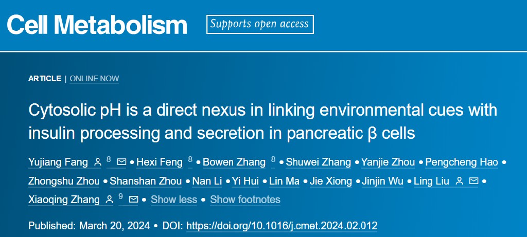 2024年3月20日,太阳成集团tyc33455cc官网/附属东方医院章小清/刘玲/房玉江团队在国际顶级学术期刊《细胞·代谢》(Cell Metabolism)上发表了题为“Cytosolic pH is a direct nexus in linking environmental cues with insulin processing and secretion in pancreatic β cells”的研究成果。研究发现胞内pH-Smad5信号通路调控胰岛素加工与分泌的全新生理功能,该通路异常是糖尿病发生发展的重要病理生理机制,为糖尿病的干预提供了新的视角。