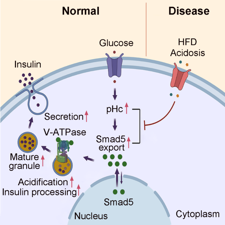 研究人员通过建立酸碱报告模型小鼠,发现高糖刺激会引起胰腺β细胞GFP-Smad5从细胞核转位至细胞浆,说明高糖刺激引起β细胞胞内pH升高。为了探究这一现象的生理病理意义,研究人员在胰腺β细胞条件敲除Smad5,敲除Smad5引起小鼠高血糖及糖耐量异常,并进一步证实敲除Smad5引起小鼠高血糖的原因是胰岛素分泌水平降低及胰岛素原表达增加,说明敲除Smad5引起胰岛素加工过程受阻。机制方面,研究人员证明Smad5与V-ATPase(胰岛素分泌囊泡酸化的关键调节酶)的亚基ATP6V1A结合,促进V-ATPase酶活性,并加速分泌囊泡酸化,从而促进由胰岛素原剪切为成熟胰岛素的加工过程。
