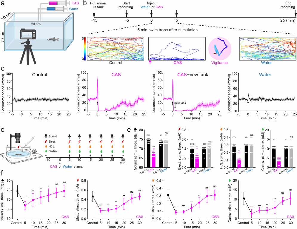 图1 CAS能可靠地诱导斑马鱼产生持续的警觉行为,并增加其对厌恶刺激的敏感性