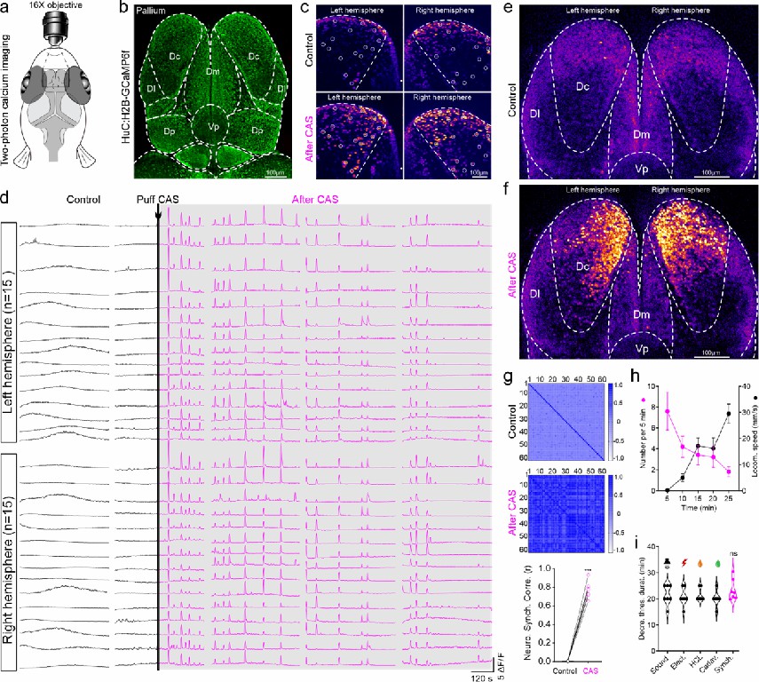 图2 CAS诱导警觉状态的神经表征是斑马鱼Dc区神经元的低频高振幅同步活动