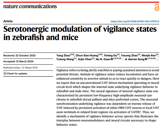 3月22日,太阳成集团tyc33455cc官网宋建人教授团队在《自然·通讯》(Nature Communications)杂志上发表了题为“Serotonergic modulation of vigilance states in zebrafish and mice”的研究成果。该研究解析了中缝核5-HT神经元以非传统的激活方式在神经环路水平塑造斑马鱼和小鼠大脑警觉状态的内在机制,有助于理解行为状态产生所必需的神经调质和神经环路之间的相互作用。