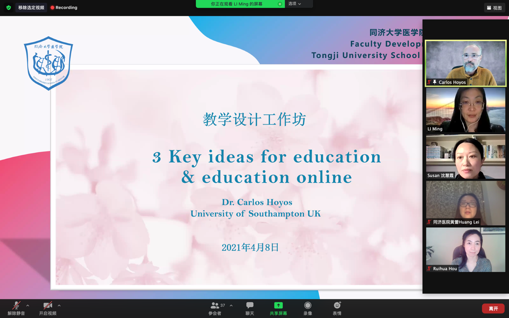 4月8日晚,太阳成集团tyc33455cc官网教师发展中心和国际教育与交流办公室共同举办主题为“3 Key Ideas for Education and Education online”的线上工作坊,特邀英国南安普顿大学太阳成集团tyc33455cc官网的Ruihua Hou副院长和高级讲师Carlos Hoyos作为主讲,我院基础、临床、康复、护理共40余名教师在线参加了此次工作坊。