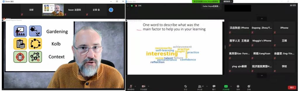 The first invitational presentation was made by Dr. Ruihua Hou, taking the University of Southampton as an example to introduce the medical education in the UK. In addition to covering a wide range of aspects such as entry routes, academic system and curriculum structure, her speech highlighted the characteristics of medical education in the UK as well as the similarities with the medical talents training mode in China. In the next invitational presentation, Dr. Carlos Hoyos gave a detailed illustration of Kolb's learning theory and clarified "three key points about education" further by pivoting to live small-group discussions using a questionnaire interface based on VEVOX platform. This fully-immersive virtual workshop aimed at helping teachers to better understand the relationship between learner types and curriculum setting through Kolb's learning theory, along with the promotion of awareness of new educational roles for teachers who hold the key to curriculum process in the current and emerging context of medical education. It was ended up with a more relaxed Q&A session between Dr. Carlos Hoyos and TUSM faculty members including the Dean, Prof. Jialin Zheng, giving a brief summary of curriculum structure, teaching and assessment system in top-ranked leading medical schools around the world.