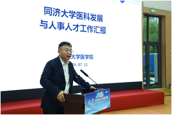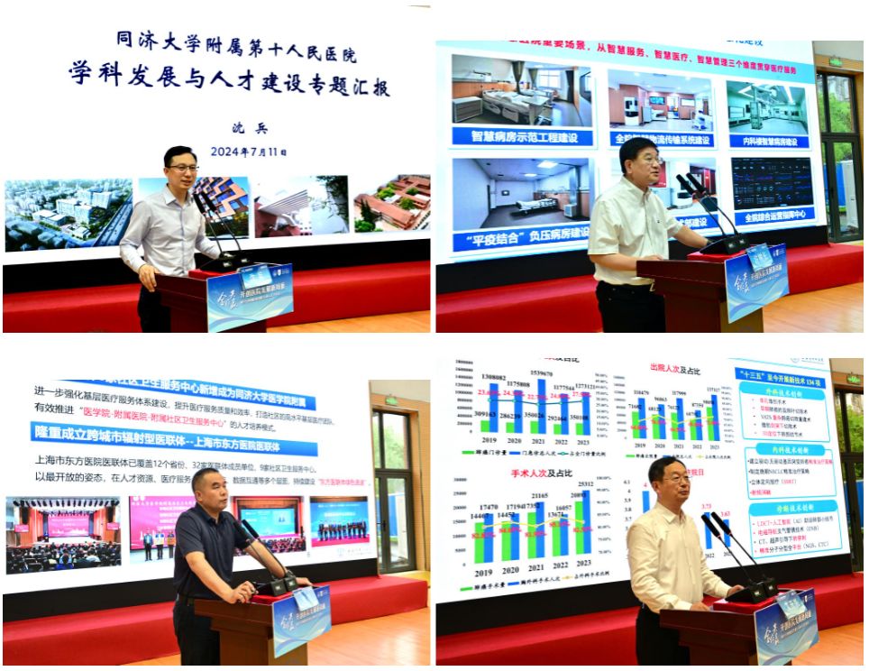 附属第十人民医院院长沈兵、附属同济医院党委书记许树长、附属东方医院党委书记李明、附属上海市肺科医院院长艾开兴、附属妇产科医院副院长(主持工作)王薇先后作学科发展与人才建设专题汇报,介绍了医院在医学综合交叉、医研融合、平台建设、人才引育等方面的举措和成效。