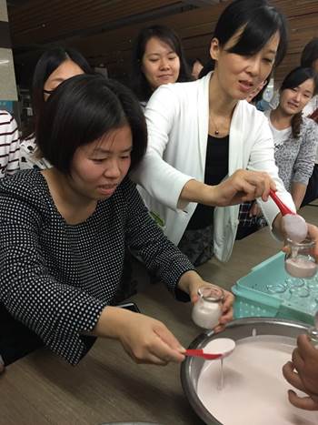 烘焙活动开始后,我院教职工在专业的烘焙师傅指导下,进行了现学现做曲奇饼干和奶冻两种类型的烘焙体验。