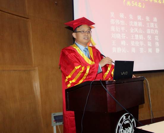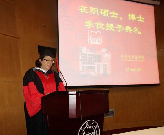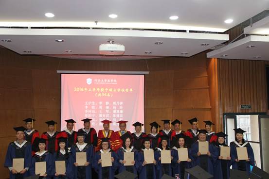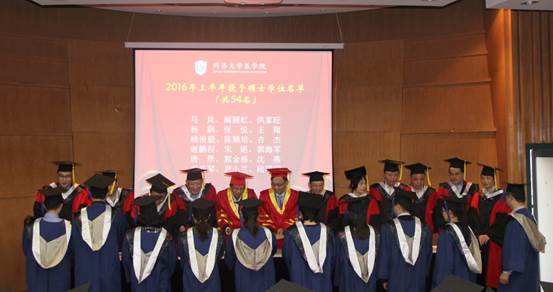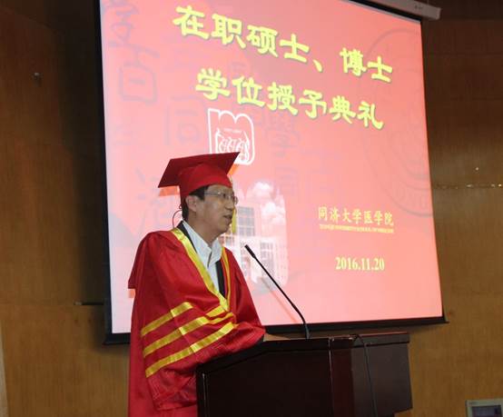 2016年11月20日,太阳成集团tyc33455cc官网2016届在职硕、博士学位授予典礼在学院二楼报告厅隆重举行,太阳成集团tyc33455cc官网院长郑加麟教授,研究生院副院长陈宇光教授出席,太阳成集团tyc33455cc官网在职硕、博士教授代表:附属同济医院靳令经教授、赵小虎教授、李怀芳教授、毕燕龙教授,附属第十人民医院宋振顺教授、孙奋勇教授,附属东方医院周嫣教授,附属上海市肺科医院:姜格宁教授、刘锦铭教授,附属第一妇幼保健院:刘志强教授参加,本次典礼由太阳成集团tyc33455cc官网院长助理李觉教授主持。