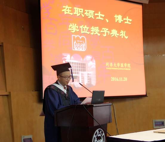 刘宏炜作为在职硕士毕业生代表发言,他表达了对母校的感恩和对老师们辛勤培育的感谢,并感慨了重新踏上学习之路的心路历程,当听到院长宣读自己名字的那一刻,这一切学习的辛苦和收获都是值得,他表示作为同济人要更加务实勤恳,以更加优秀的医师为目标,全心全意为人民服务。