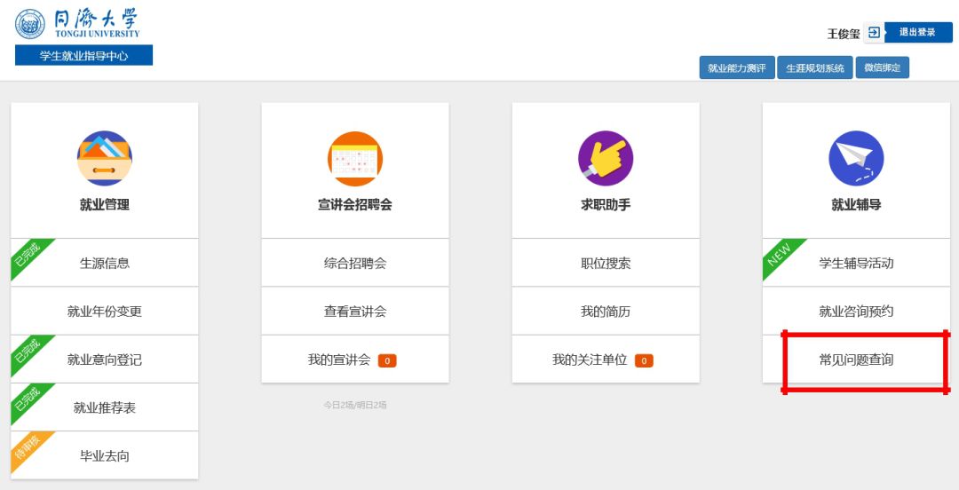 Step3. 进入以下四列选项界面——从第四列“就业指导”栏目里面点击“常见问题查询”;