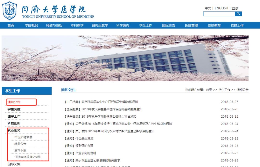 Step4. 进入以上页面,从“通知公告”查找相关通知,“就业服务”获取就业信息