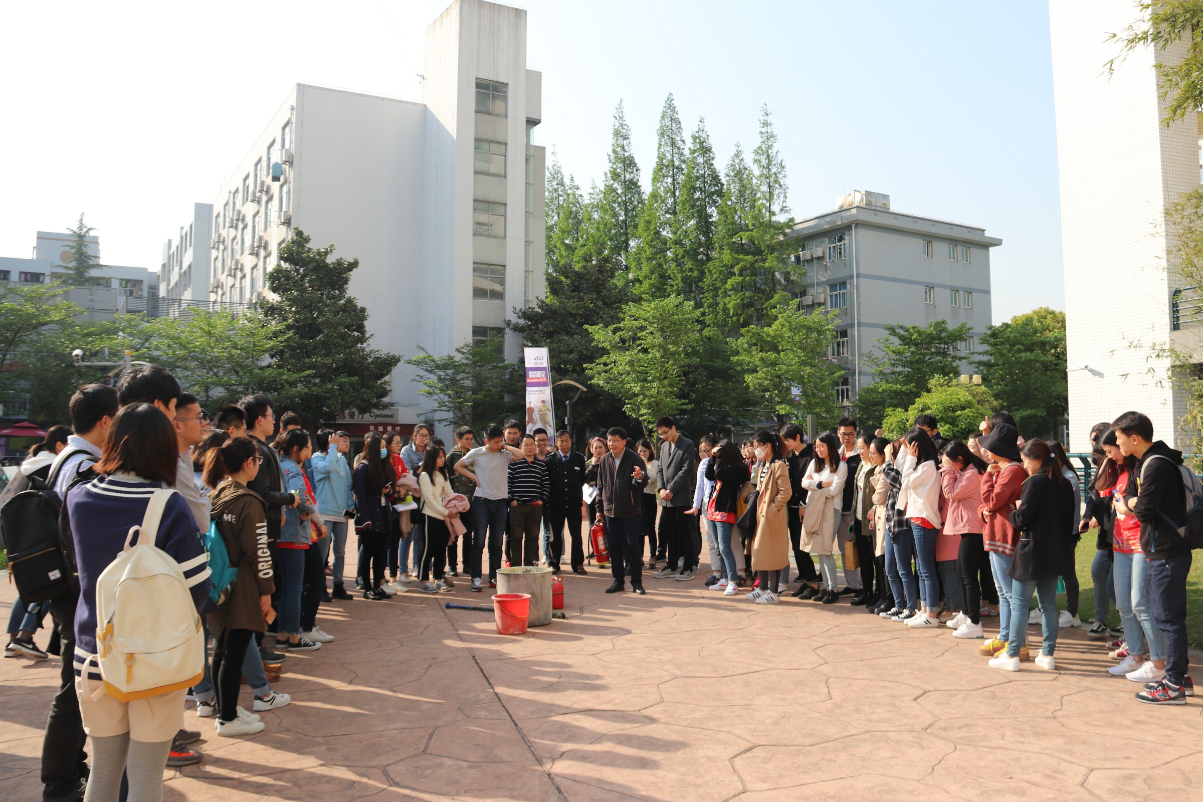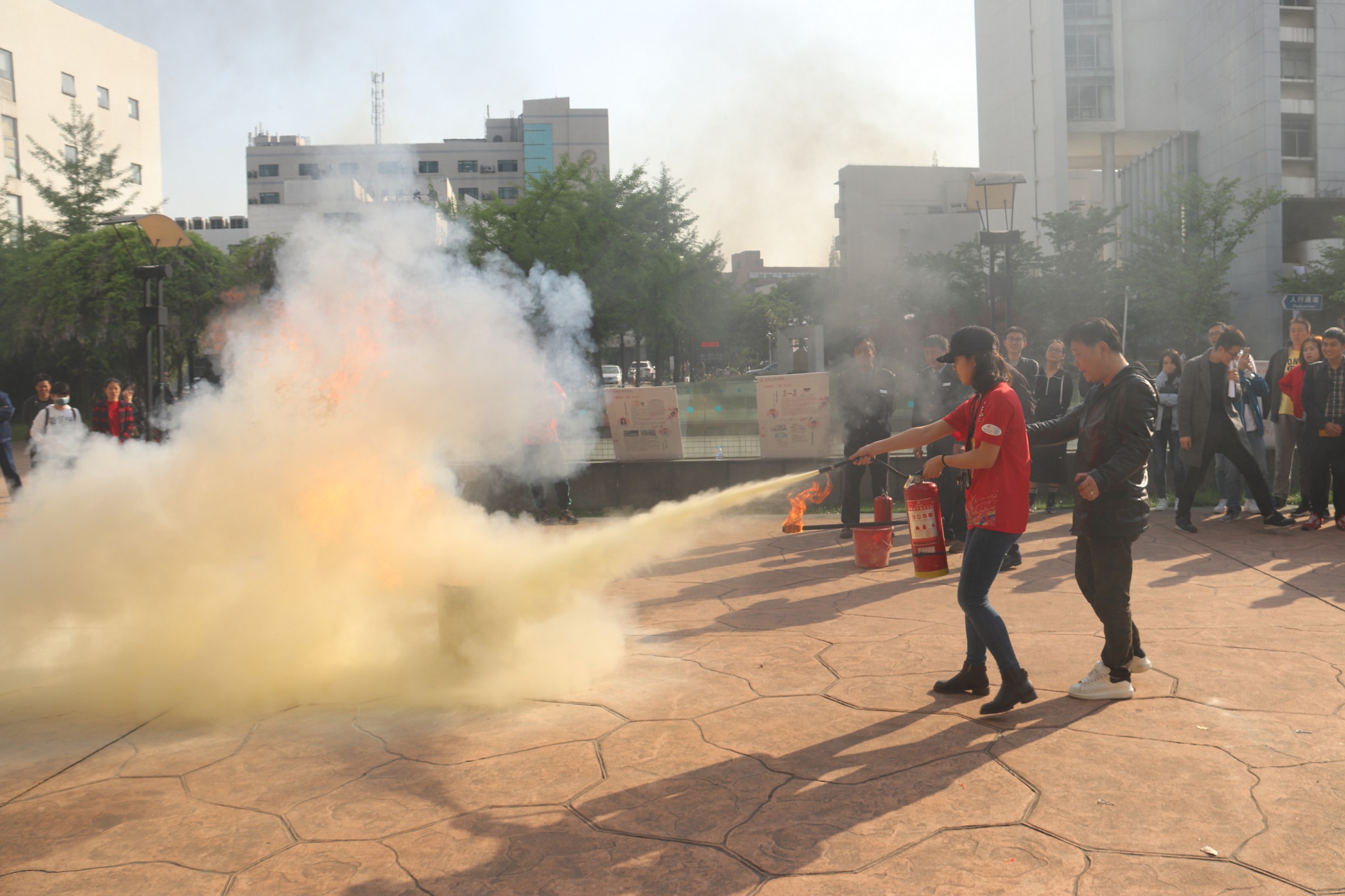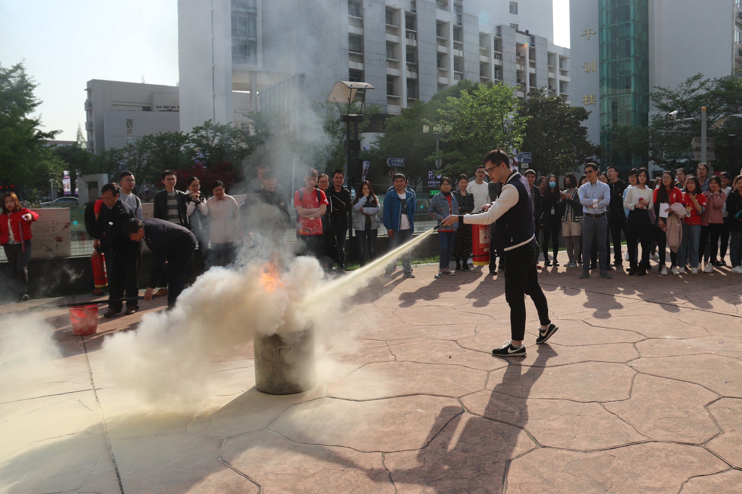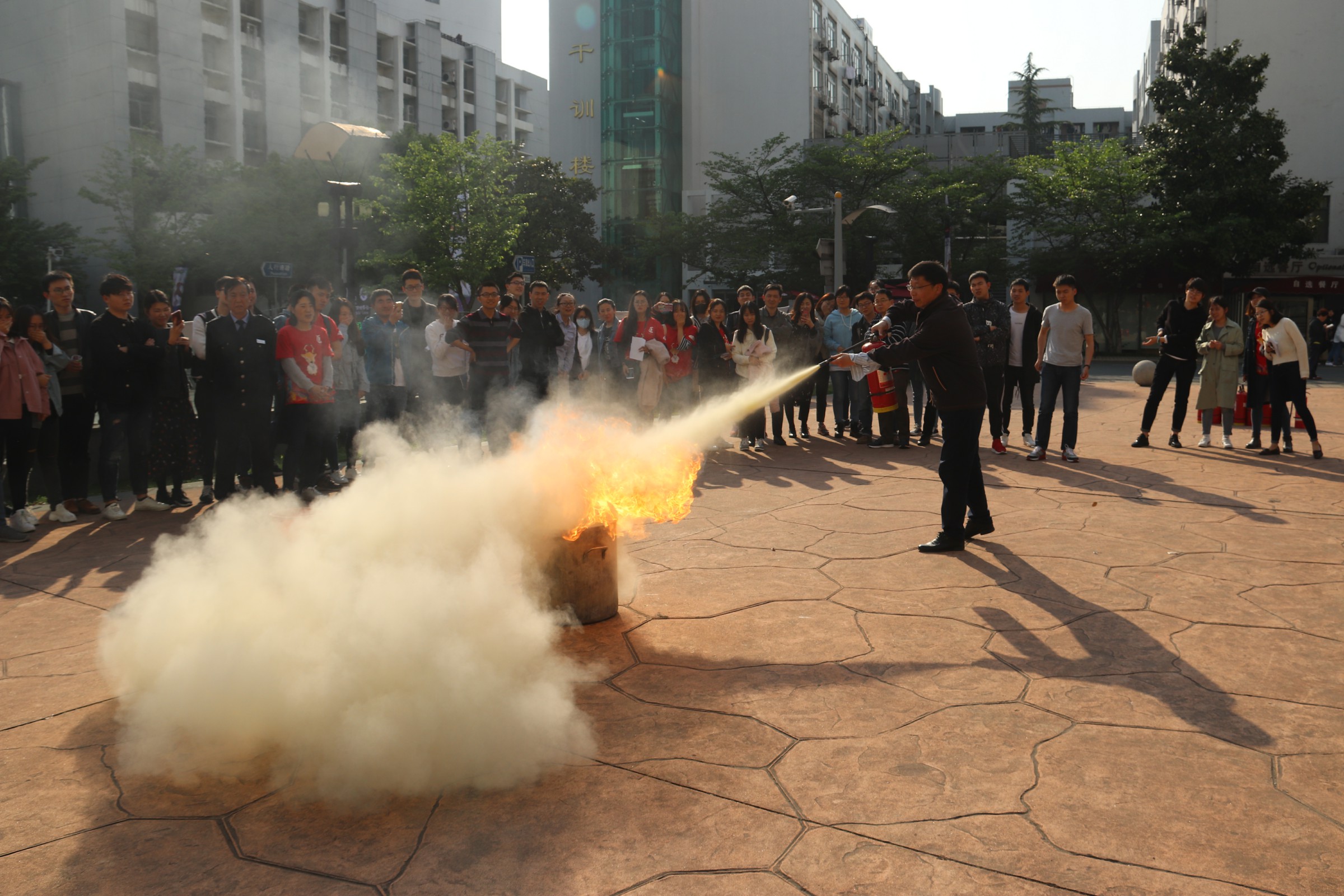 在培训讲座结束后,祝建新老师带领参与讲座培训的同学来到太阳成集团tyc33455cc官网前的广场,演示如何正确使用灭火器。他首先介绍了灭火器的构造和正确使用方式,然后现场演示了面对火情时如何正确使用灭火器。同学们纷纷尝试,在现场老师们的指导下学会了使用灭火器。