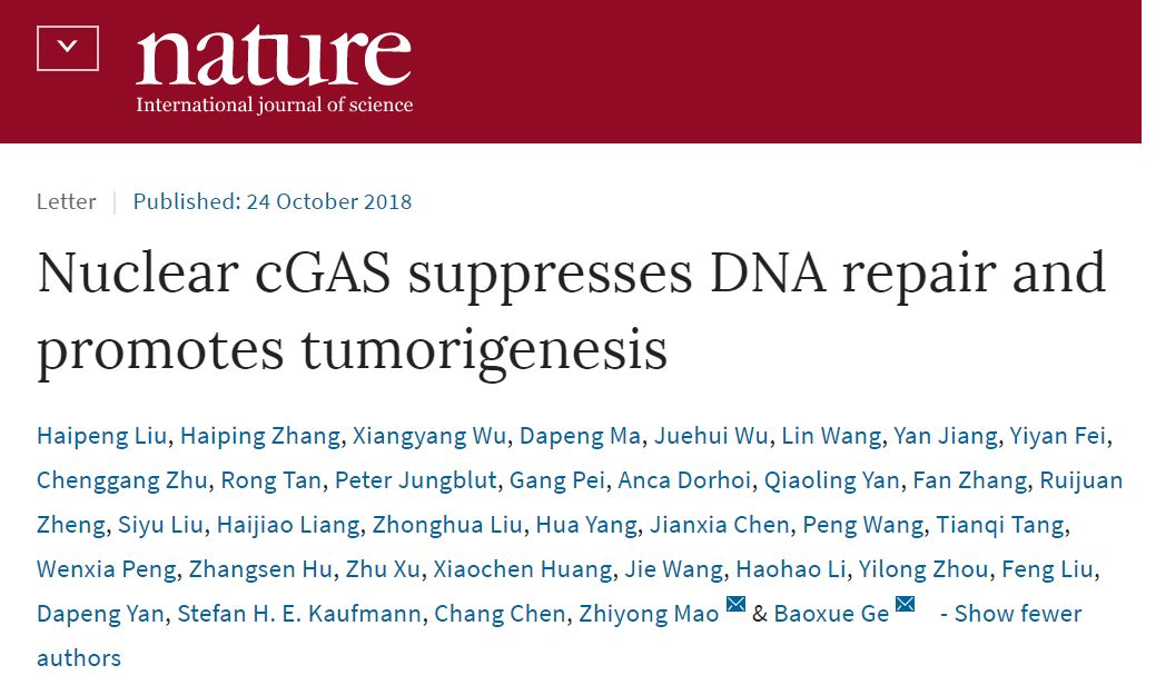 “cGAS会抑制DNA修复、促进肿瘤形成,这是我们在国际上首次发现cGAS所具有的一个全新功能。”戈宝学教授介绍,以往对cGAS的认识都是集中在固有免疫上,即cGAS作为一个DNA受体,能够对外界病原微生物以及人体细胞质内自身DNA进行识别,并激活免疫应答,对它的生理过程研究也只是在细胞质内。然而,cGAS这一促癌功能是首次被发现,因此这一成果将把cGAS的功能研究推向一个崭新的领域。