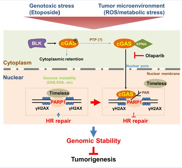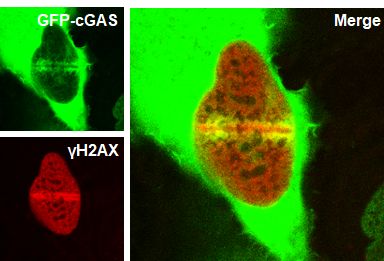 科研人员合作研究发现,cGAS在细胞发生DNA损伤时可转位入细胞核内,并被招募至DNA受损的位点,通过干扰PAPR1/Timeless复合体形成,抑制DNA双链断裂损伤修复,进而增加了基因组的不稳定性并最终增加了肿瘤生成风险。研究还发现,cGAS对DNA修复的抑制作用是一条完全独立于其DNA识别功能的通路。