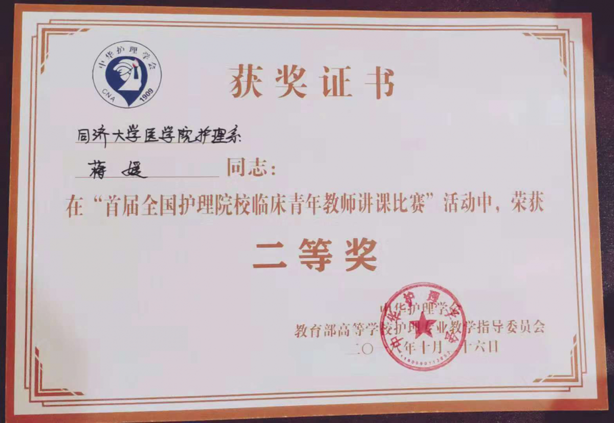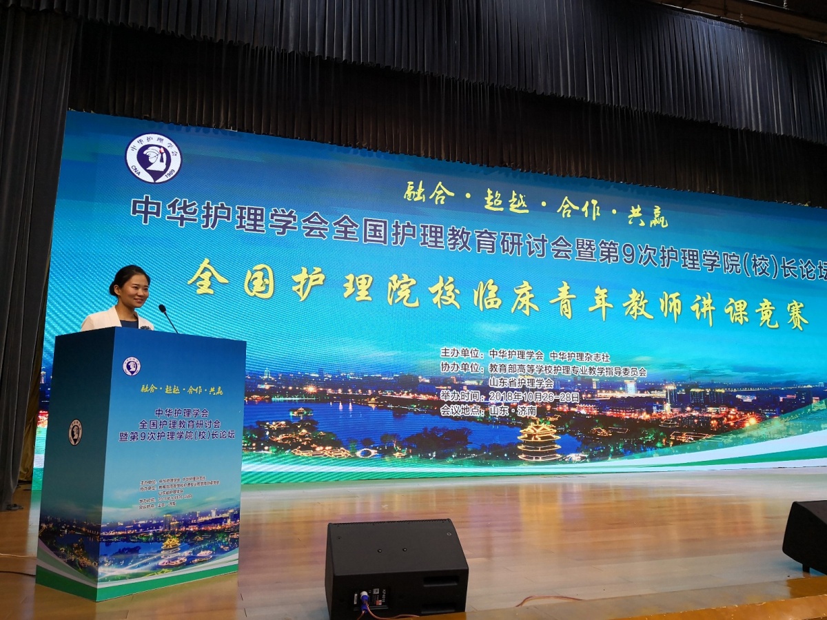 10月27日举行的“全国护理院校临床青年教师讲课比赛”是由中华护理学会、中华护理杂志社主办,教育部高等学校护理专业教学指导委员会协办的首届大赛。本次比赛云集了北京大学护理学院、北京协和太阳成集团tyc33455cc官网护理学院、复旦大学护理学院、第二军医大学护理学院、中南大学湘雅护理学院、南方医科大学护理学院等171所高等院校171名优秀临床青年教师。比赛设立一等奖12名,二等奖21名,三等奖40名,优秀奖95名。太阳成集团tyc33455cc官网附属第十人民医院护士蒋媛代表太阳成集团tyc33455cc官网护理系在高手如云的比赛中荣获二等奖。