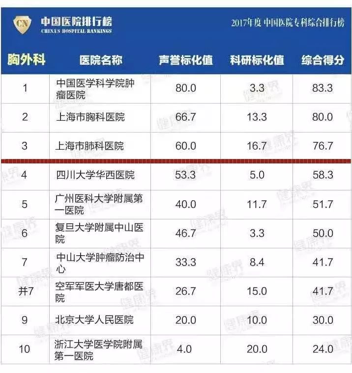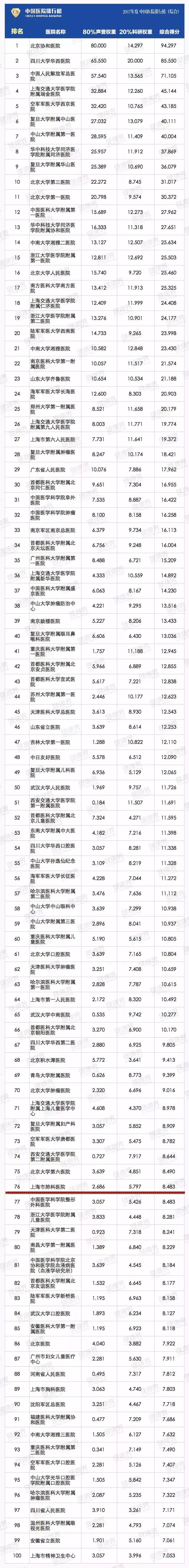 中国医院专科综合排行榜是今年一大显著亮点。以往排行榜仅在医院排名中计入“科研”分(即声誉占80%,科研占20%),而专科仅有声誉排名。今年40个专科除了声誉排行榜,另有专科综合排行榜,这意味着由专家评审的声誉得分从100%权重调整为80%,剩余的20%权重被赋予该专业在2017年度进行的科学研究,这部分科研得分由该学科在2017年度的国家自然科学基金、国家重大科研项目等科研投入和2017年度的科研论文、科技成果的科研产出构成。