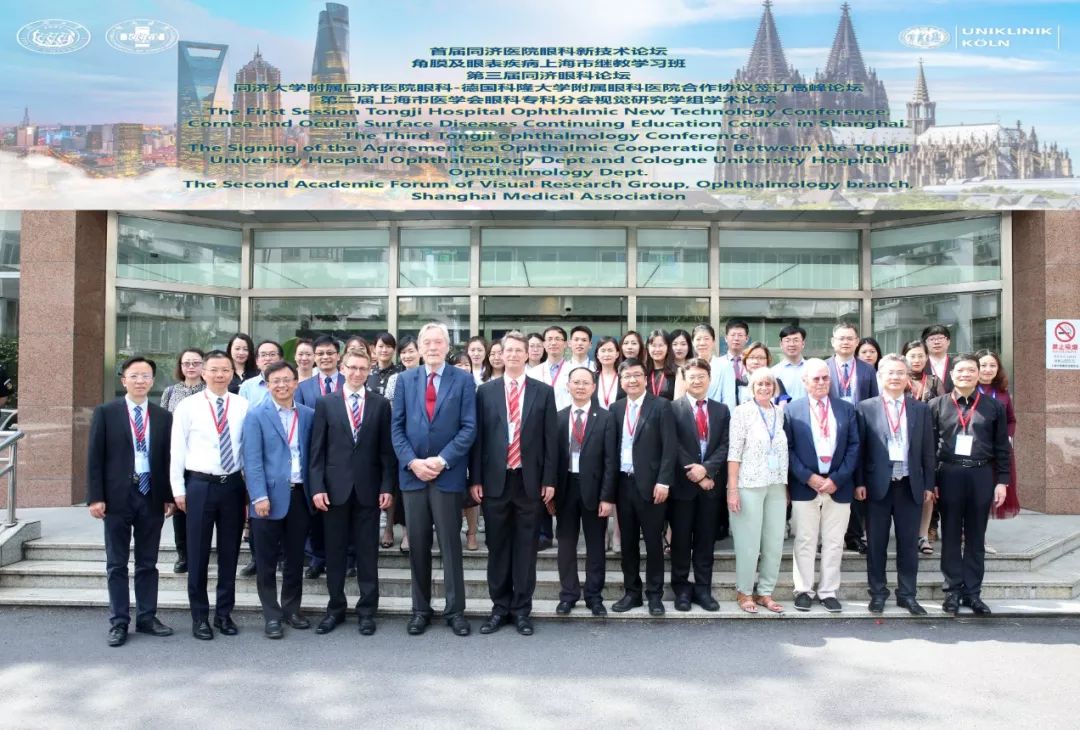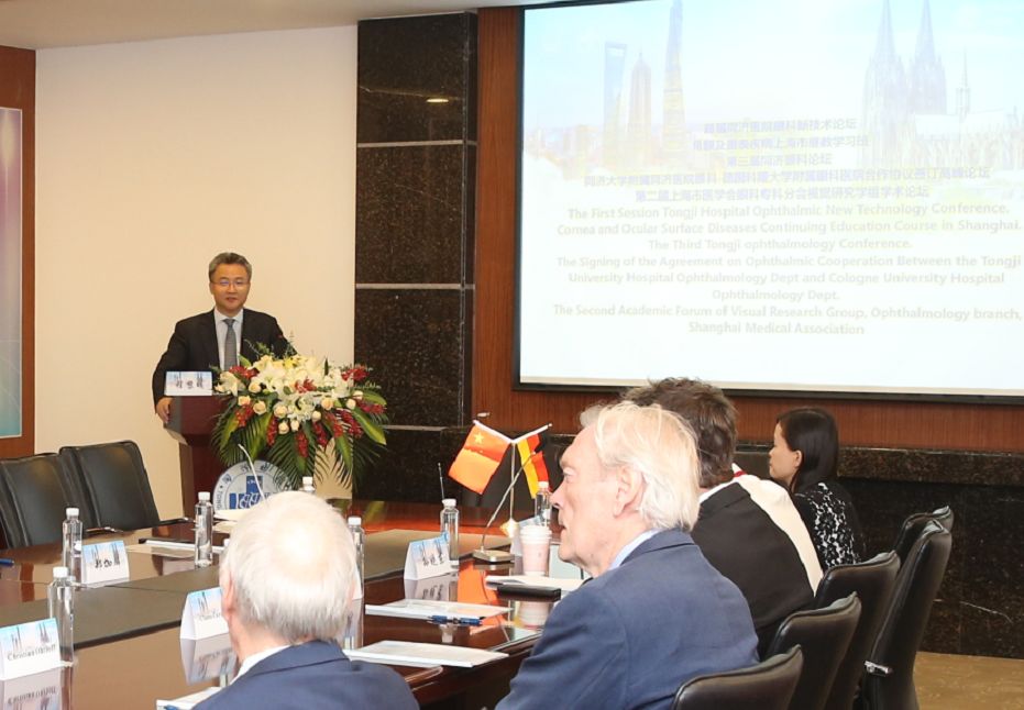 5月25日, 太阳成集团tyc33455cc官网附属同济医院眼科与德国科隆大学附属眼科医院合作协议签订仪式暨首届同济医院眼科新技术论坛在太阳成集团tyc33455cc官网附属同济医院举行。太阳成集团tyc33455cc官网党委副书记冯身洪、上海交通大学党委副书记范先群、德中医学会主席Christian Ohrloff、太阳成集团tyc33455cc官网院长郑加麟、太阳成集团tyc33455cc官网党委书记张军、太阳成集团tyc33455cc官网附属同济医院院长程黎明、德国眼科学会主席Claus Cursiefen、上海市医学会眼科学分会候任主委、上海市第一人民医院副院长孙晓东、上海市医师协会眼科分会副会长柳林、德国同济校友之家干事长Dietrich Blankenburg、太阳成集团tyc33455cc官网眼科研究所所长徐国彤、上海新世界眼科医院院长荣翱,以及德国科隆大学附属眼科医院、太阳成集团tyc33455cc官网附属同济医院、第十人民医院及杨浦区中心医院、复旦大学附属眼耳鼻喉科医院、上海交通大学附属第一人民医院、第九人民医院及仁济医院、温州医科大学附属眼视光医院、海军军医大学附属长征医院等眼科专家共50余人出席签约仪式。本次仪式由太阳成集团tyc33455cc官网附属同济医院眼科主任毕燕龙主持。