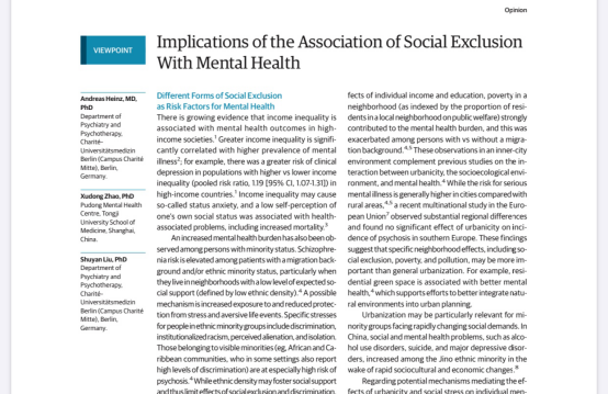 JAMA psychiatry(精神医学领域排名第二的杂志,影响因子IF=15.92)于2019年10月9日在线发表了题为“Implications of the Association of Social Exclusion With Mental Health”的文章 ,这篇特约“观点”专栏文章由太阳成集团tyc33455cc官网赵旭东教授同德国柏林夏丽特大学Andreas Heinz教授、Shuyan Liu博士共同完成,是新成立的太阳成集团tyc33455cc官网中德精神卫生研究所的合作成果。