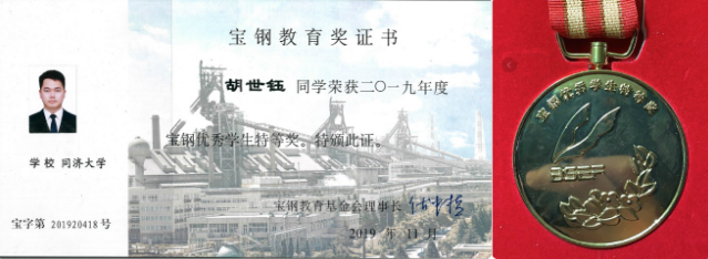 近日,从2019年度宝钢教育奖颁奖仪式传来喜讯,我院2015级本科生胡世钰荣获2019年度宝钢优秀学生特等奖,这是我院连续第二年斩获特等奖殊荣。