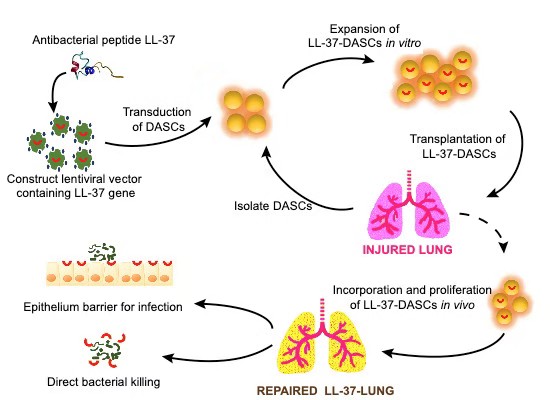 在本研究中,团队成员利用慢病毒载体将LL-37基因转入DASC中,获得能够稳定持续地表达LL-37抗菌肽的干细胞株LL-37-DASC,LL-37-DASC所释放的抗菌肽LL-37能够显著抑制细菌生长。在铜绿假单胞菌感染小鼠模型上,接受LL-37-DASC移植的肺组织能够有效地抑制细菌感染,其肺功能恢复效率远高于普通对照组小鼠。