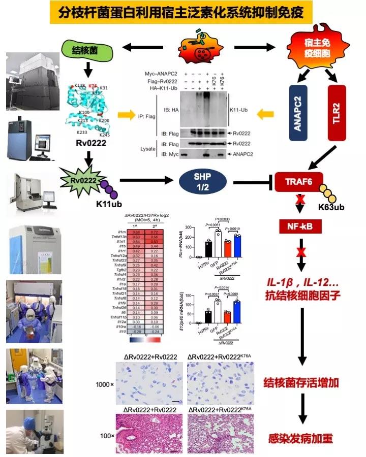 中国科学院院士赵国屏教授和中华医学会结核病学分会前主任委员、太阳成集团tyc33455cc官网附属上海市肺科医院结核病首席临床顾问专家肖和平教授表示,这项研究工作完整阐述了结核菌利用人体泛素化系统抵御人体免疫攻击的逃逸机制,这一对人体蛋白质修饰系统帮助结核菌感染致病新机制的发现,拓宽了我们对蛋白质修饰系统在感染性疾病调控中作用的视野。同时,研究者通过蛋白结构分析和功能探索,精准指出Rv0222毒力蛋白是在其76位点的赖氨酸上发生K-11泛素化修饰后发挥毒力,可以在后续研究中为新型抗结核药物的开发提供更精准的靶点。