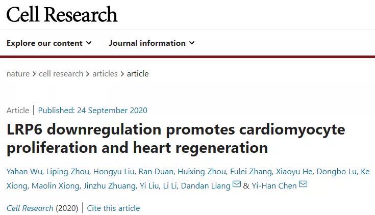 考虑到心肌细胞的有丝分裂后性质,成年哺乳动物心脏被认为是终末分化的器官。因此,通过心肌细胞增殖进行心脏修复的潜力非常有限。低密度脂蛋白受体相关蛋白6(LRP6)是Wnt共同受体,是胚胎心脏发育所必需的。9月24日,以副校长陈义汉院士、副研究员梁丹丹为共同通讯作者的研究论文在线发表于Cell Research(《细胞研究》),该论文题为“LRP6 downregulation promotes cardiomyocyte proliferation and heart regeneration”,研究发现LRP6可通过调节心肌细胞增殖在心脏修复中发挥作用。