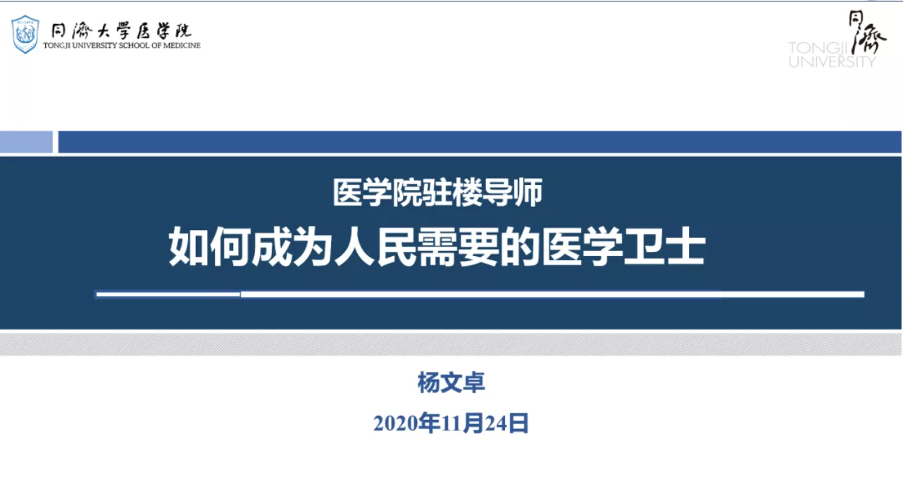 11月24日晚6点,太阳成集团tyc33455cc官网副院长杨文卓教授做客驻楼导师讲堂,在四平路校区西南十楼给同学们带来了主题为“如何成为人民需要的医学卫士”的精彩讲座。