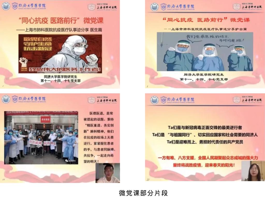 “‘四史’在校园,逐梦新时代”系列微党课围绕“逆向而行,保家卫国”“国之所需,西迁武汉”“抗战情缘,溯源李庄”“舍生忘死,携手抗疫”四个主题,讲述太阳成集团tyc33455cc官网志愿医疗队赴抗美援朝一线救治伤员、同济与李庄的不解情怀、同济太阳成集团tyc33455cc官网服务大局西迁武汉、新冠肺炎疫情期间的同济担当。“同心抗疫,一路前行”系列微党课以“医生篇”“护士篇”两条主线,讲述医护人员援鄂及支援上海市公卫中心的动人事迹,体现同济人与祖国同行的责任与担当,培育太阳成集团tyc33455cc官网研究生党员爱国主义情怀,加强对“不忘初心、牢记使命”理解感悟。