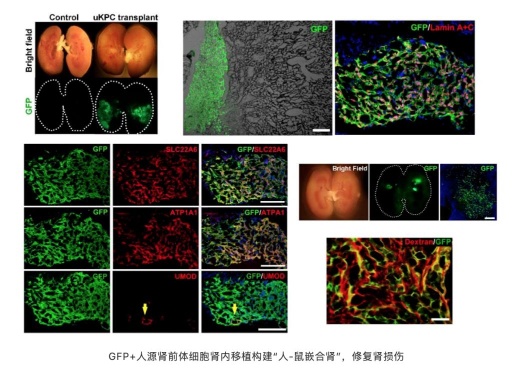 值得一提的是,研究团队把从健康人或慢性肾病患者尿液中分离的细胞进行GFP绿色荧光蛋白标记后,移植到损伤小鼠的单侧肾脏中。14天后,在小鼠肾内观察到大面积外源性人源细胞整合,成功构建出了“人-鼠嵌合肾”。这些GFP+细胞在损伤的区域形成了类肾小管的管状腔体结构,且表达不同分段的肾小管特征基因,如PAX8、ATP1A1、SLC22A6和UMOD等。对于接受了细胞移植的肾损伤小鼠,研究人员把带有红色荧光标记的小分子葡聚糖经静脉注射到其血液循环中,发现这种葡聚糖在GFP+人源肾小管结构中聚集,说明由移植的人源肾前体细胞分化形成的近端小管有功能性地与小鼠自身的肾小球过滤系统相连。
