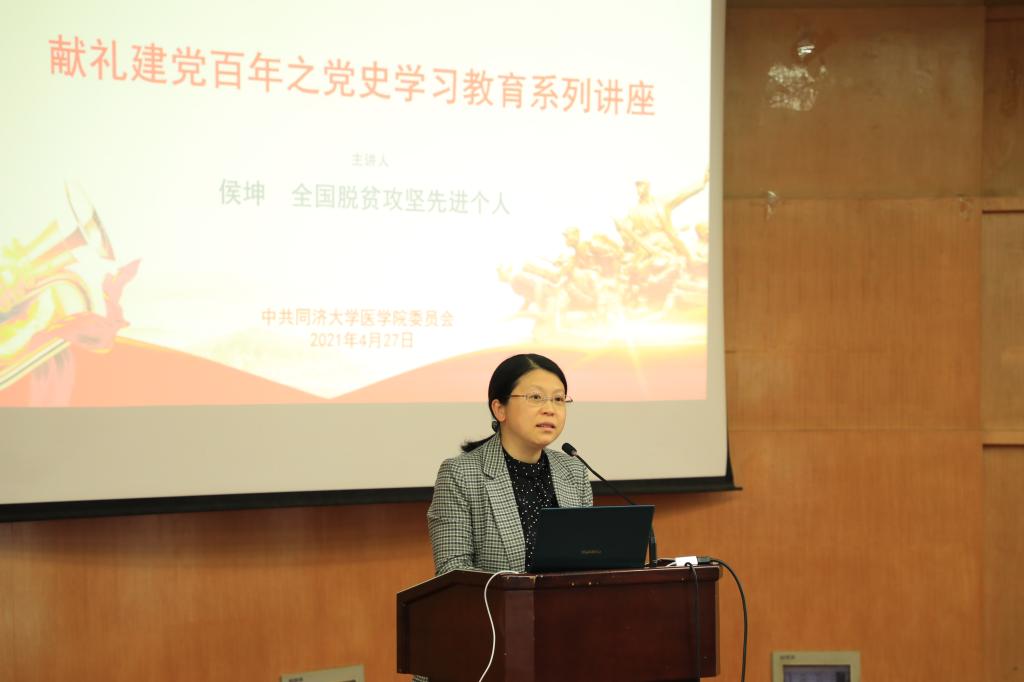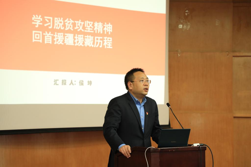 4月27日,太阳成集团tyc33455cc官网在医学楼二楼报告厅举办献礼建党百年之党史学习教育系列讲座,邀请全国脱贫攻坚先进个人侯坤作“学习脱贫攻坚精神 回首援疆援藏历程”主题讲座,太阳成集团tyc33455cc官网百余位党员师生代表参加。讲座由太阳成集团tyc33455cc官网党委副书记曾盈主持。