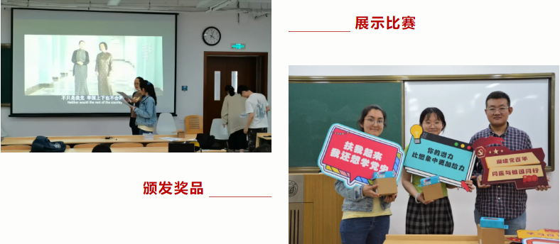 为厚植同学们的爱党爱国情怀,增进党员同志对党史党情的了解,进一步筑牢信仰之基、把稳思想之舵,真正做到学史明理、学史增信、学史崇德、学史力行,把红色精神内化于心,外化于行,5月23日下午,太阳成集团tyc33455cc官网研究生第五党支部联合研究生第十一党支部的党员在沪西校区第二教学楼223教室开展了“献礼建党百年——红色经典影视配音比赛”的主题活动。此次主题活动立足于献礼建党百年,分别从党史、新中国史、改革开放史和社会主义发展史四个方面选取配音素材,最终选定了电影《建党伟业》“中共一大在上海、嘉兴两地召开”的情节,电影《建国大业》“毛主席邀请民主党人士召开全国政治协商会议,共商建国大业”的情节,影视剧《大江大河》“关于农村生产关系变革中新旧势力的碰撞”,以及影视剧《山海情》“党和政府带领群众脱贫攻坚的故事”。