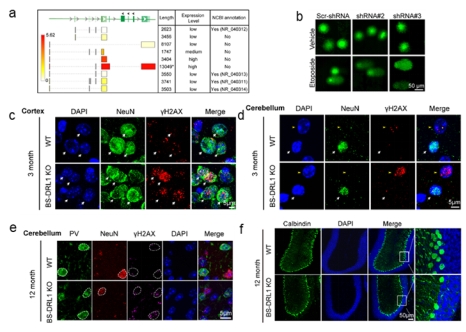 体内体外实验表明,BS-DRL1的缺失会使原代培养的神经细胞,小鼠大脑皮层及小脑中浦肯野细胞在损伤诱导下积累更多的损伤DNA(附图b-d)。且未修复的DNA损伤在生理条件下也会随着小鼠的年龄的增加而积累(附图e),进而造成特定神经细胞随着衰老渐进性死亡(附图f)。